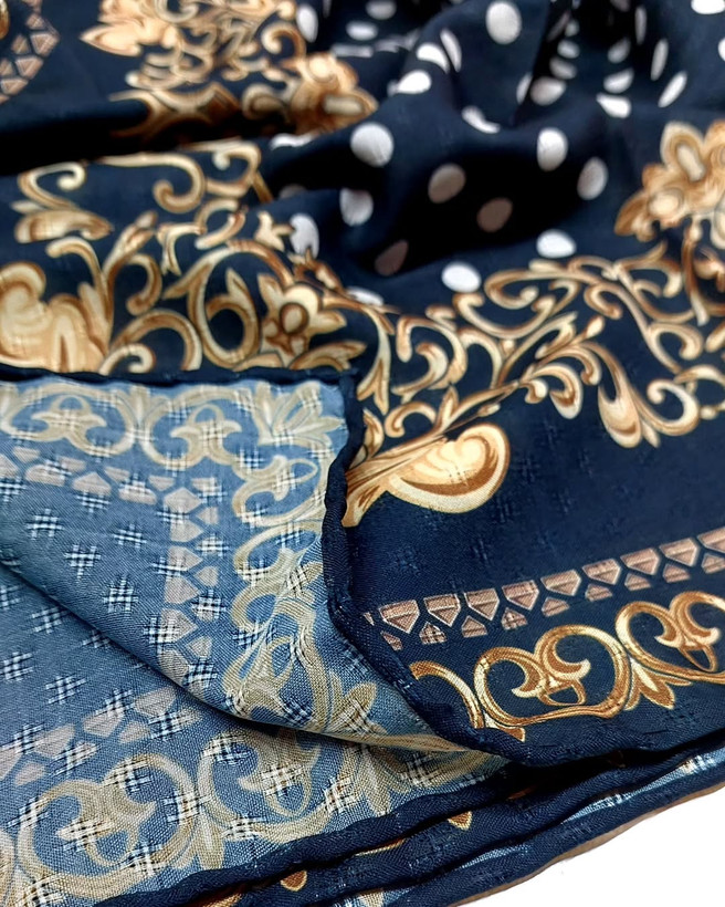 روسری قواره کوجک زنانه طرح سلطنتی خالدار قواره کوچک در دو رنگ سرمه ای و مشکی قواره 100 دور دست دوز شده چاپ سفید ندارد ایستایی صد درصد اصلا لیز نیستن